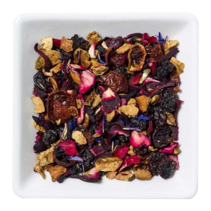 Hibiscus, rozenbottel schillen, appelstukjes, druiven, zwarte bessen, aroma, korenbloem bloemblaadjes.