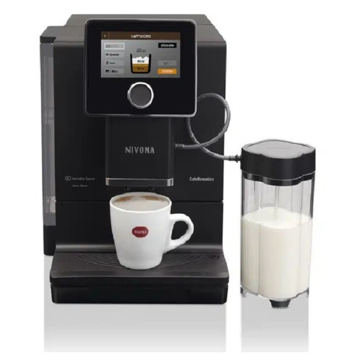 Met de introductie van de CafeRomatica 9-serie heeft NIVONA nu ook een automaat voor de koffieliefhebber die alle moderne gemakken wenst. De 9-serie is vormgegeven zoals je van NIVONA gewend bent, eenvoudig, modern, zonder opsmuk, maar van alle gemakken voorzien. De machine is uitgevoerd in fraai matzwart of titaniumkleurig kunststof met roestvrijstalen accenten. Het fraaie tft-touchscreen springt direct in het oog. De in hoogte verstelbare uitloop biedt je de mogelijkheid verschillende maten porselein en glazen te gebruiken, dus ook dat mooie, hoge Latte Macchiatto glas. De uitloop is voorzien van koppenverlichting waardoor tijdens de bereiding het kopje elegant wordt verlicht, tijdens het koffiezetten amberkleurig en tijdens het melkschuimen wit. Het waterreservoir van maar liefst 2.2 liter is te verlichten in wel 8 verschillende kleuren. In het bonenreservoir is ruimte voor 250 gram koffie.