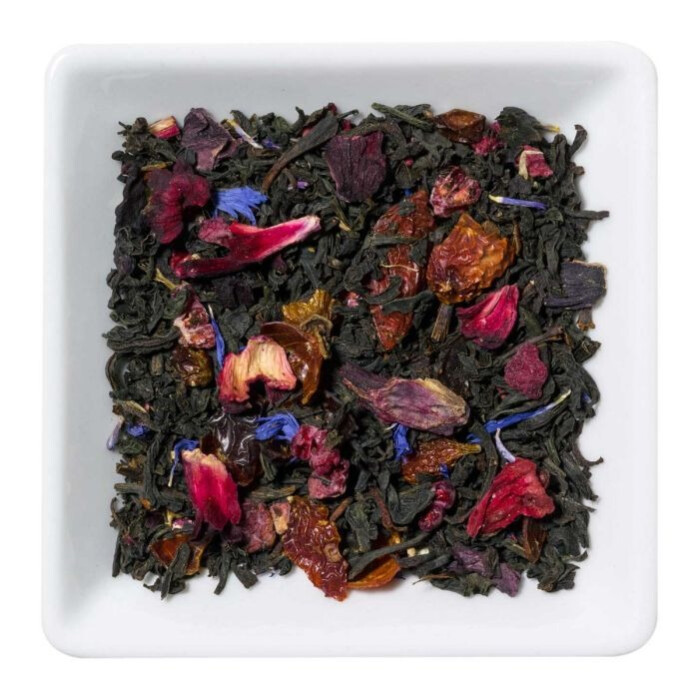 Thee (80%), rozenbottel schil, hibiscus, aroma, goji bessen, frambozen stukjes (2%), guarana zaad, duindoorn bessen, korenbloem bloemblaadjes, natuurlijke aroma, granaatappelsap concentraat.